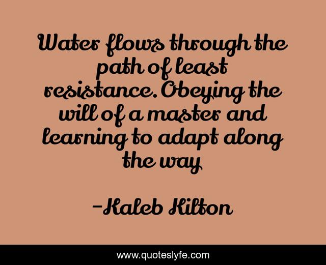 This page presents the quote "Water flows through the path of least resistance.Obeying the will of a master and learning to adapt along the way". Author of this quote is Kaleb Kilton. This quote is about master, adapt, water-flow-meter, obey,.