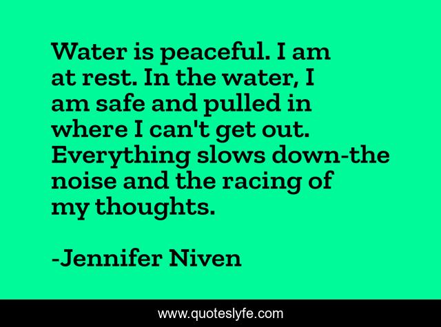 This page presents the quote "Water is peaceful. I am at rest. In the water, I am safe and pulled in where I can't get out. Everything slows down-the noise and the racing of my thoughts.". Author of this quote is Jennifer Niven. This quote is about life, anxiety, love, scared, peace, water, relaxation, affection,.