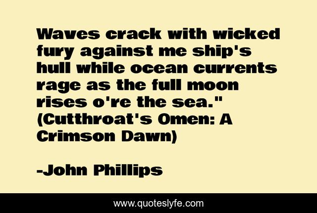 This page presents the quote "Waves crack with wicked fury against me ship's hull while ocean currents rage as the full moon rises o're the sea." (Cutthroat's Omen: A Crimson Dawn)". Author of this quote is John Phillips. This quote is about caribbean, pirates, ships, pirates-of-the-caribbean, paranormal-romance, history,.