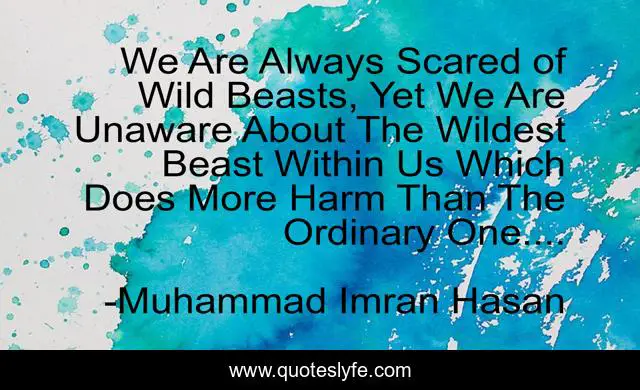 This page presents the quote "We Are Always Scared of Wild Beasts, Yet We Are Unaware About The Wildest Beast Within Us Which Does More Harm Than The Ordinary One....". Author of this quote is Muhammad Imran Hasan. This quote is about heart, life, soul, realize, judge, truth, realization, selfishness, spirit,.