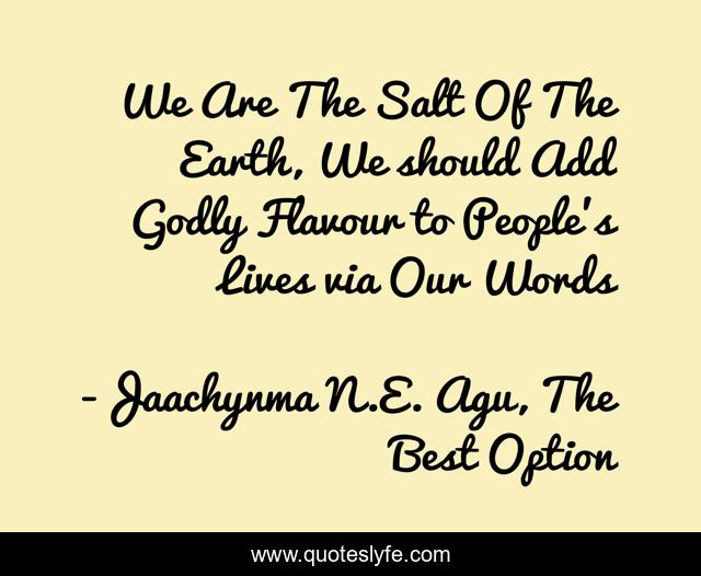 This page presents the quote "We Are The Salt Of The Earth, We should Add Godly Flavour to People's Lives via Our Words". Author of this quote is Jaachynma N.E. Agu, The Best Option. This quote is about inspirational, examplary, godliness, christian-living, words, enthusiasm,.