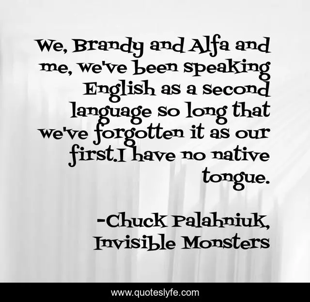 This page presents the quote "We, Brandy and Alfa and me, we've been speaking English as a second language so long that we've forgotten it as our first.I have no native tongue.". Author of this quote is Chuck Palahniuk, Invisible Monsters. This quote is about metaphor, language,.
