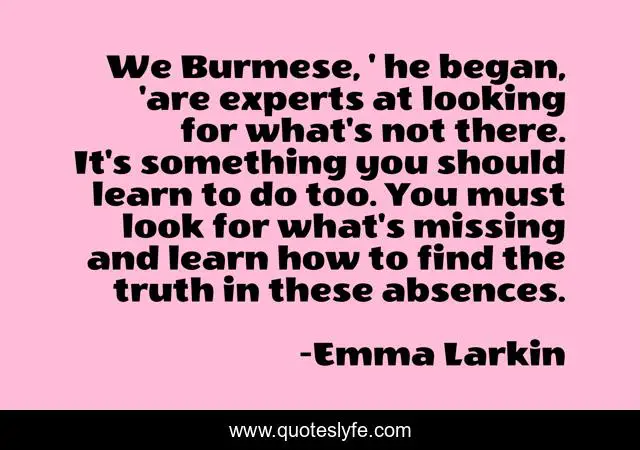 This page presents the quote "We Burmese, ' he began, 'are experts at looking for what's not there. It's something you should learn to do too. You must look for what's missing and learn how to find the truth in these absences.". Author of this quote is Emma Larkin. .
