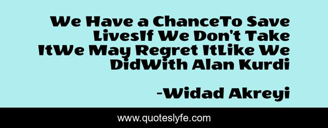 This page presents the quote "We Have a ChanceTo Save LivesIf We Don't Take ItWe May Regret ItLike We DidWith Alan Kurdi". Author of this quote is Widad Akreyi. This quote is about kobani, dr-widad-akrawi, christians, human-rights, violence-against-women, peace, kobane, civil-society, yazidis,.