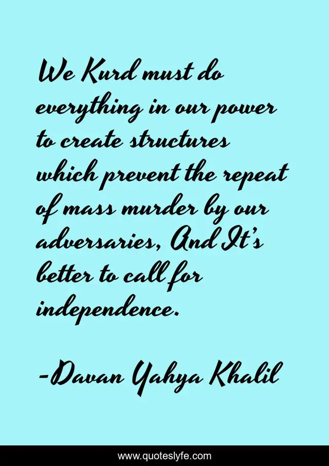 This page presents the quote "We Kurd must do everything in our power to create structures which prevent the repeat of mass murder by our adversaries, And It’s better to call for independence.". Author of this quote is Davan Yahya Khalil. This quote is about kurdistan, political-philosophy, political, independence,.