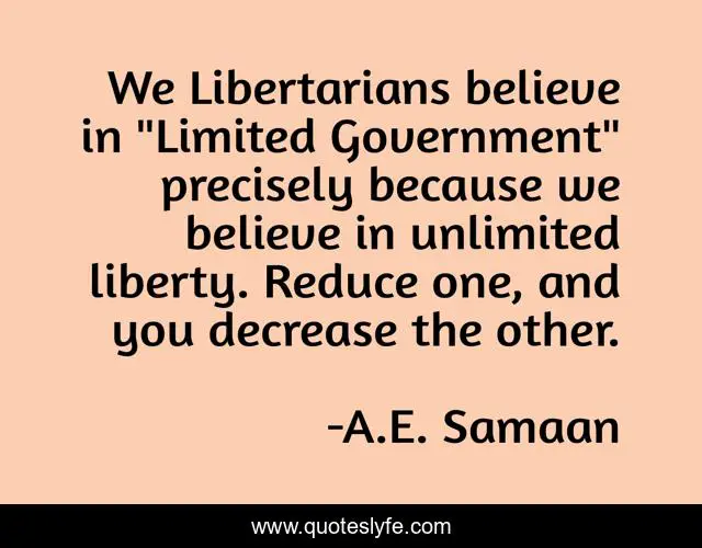 "A.E. Samaan Quotes." Quoteslyfe.com, 2025. Mon. 08 Dec. 2025. <https://www.quoteslyfe.com/quote/We-Libertarians-believe-in-Limited-Government-precisely-55146>.