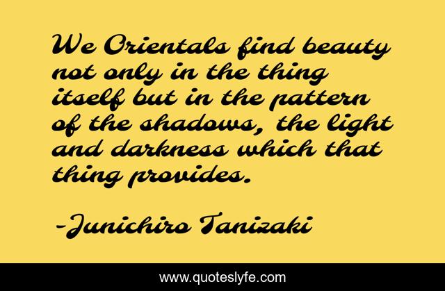This page presents the quote "We Orientals find beauty not only in the thing itself but in the pattern of the shadows, the light and darkness which that thing provides.". Author of this quote is Junichiro Tanizaki. This quote is about shadows, light, darkness,.