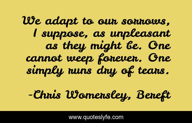 This page presents the quote "We adapt to our sorrows, I suppose, as unpleasant as they might be. One cannot weep forever. One simply runs dry of tears.". Author of this quote is Chris Womersley, Bereft. This quote is about murder, disease, crime, australia, chris-womersley, military, bereft, war,.