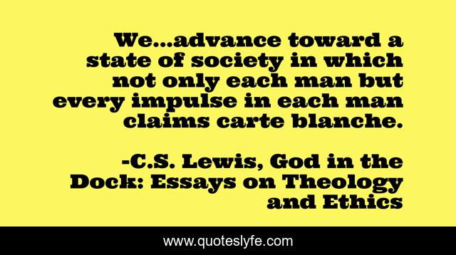 This page presents the quote "We...advance toward a state of society in which not only each man but every impulse in each man claims carte blanche.". Author of this quote is C.S. Lewis, God in the Dock: Essays on Theology and Ethics. This quote is about cs-lewis, christianity,.