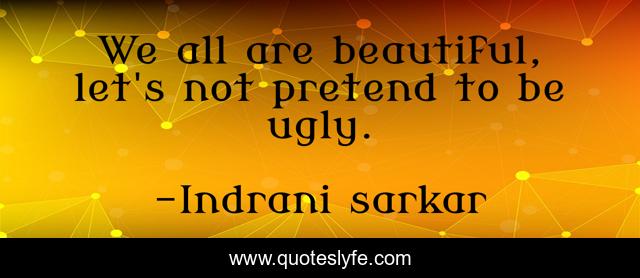 This page presents the quote "We all are beautiful, let's not pretend to be ugly.". Author of this quote is Indrani sarkar. This quote is about philosophy-of-life, philosophy, reason, reality,.