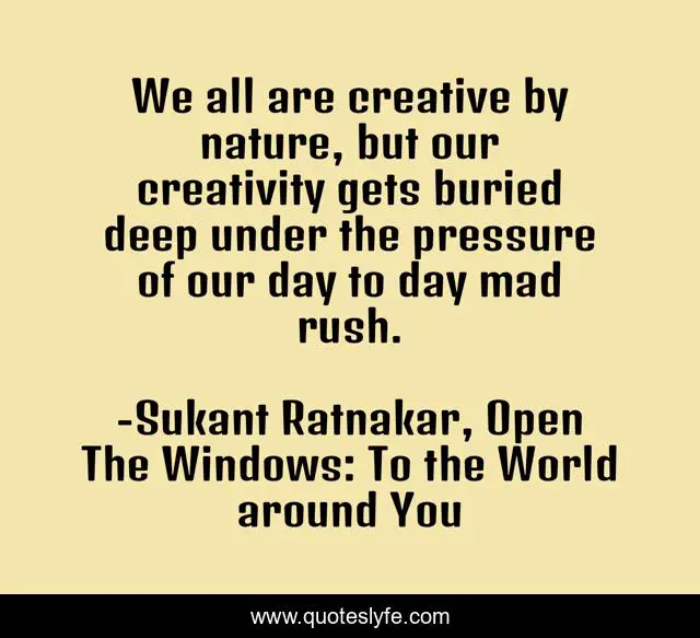 This page presents the quote "We all are creative by nature, but our creativity gets buried deep under the pressure of our day to day mad rush.". Author of this quote is Sukant Ratnakar, Open The Windows: To the World around You. This quote is about pressure, creativity, mind-body-spirit, innovation,.