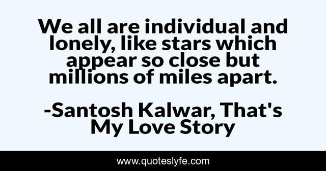 This page presents the quote "We all are individual and lonely, like stars which appear so close but millions of miles apart.". Author of this quote is Santosh Kalwar, That's My Love Story. This quote is about lonely, solitude, aloneness, individual, stars, apart,.
