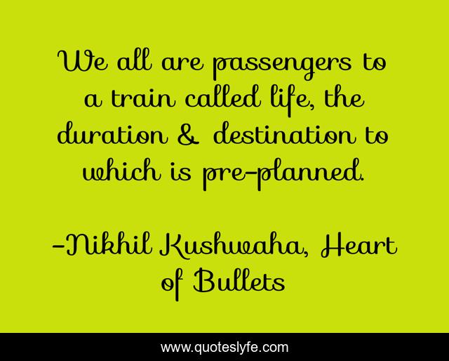 This page presents the quote "We all are passengers to a train called life, the duration & destination to which is pre-planned.". Author of this quote is Nikhil Kushwaha, Heart of Bullets. .