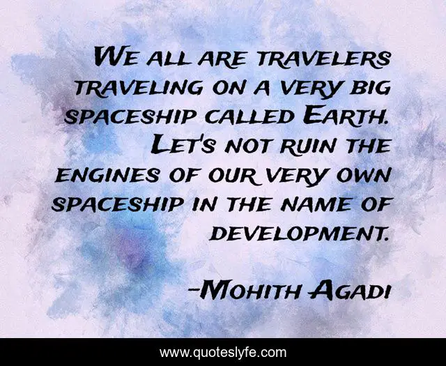 This page presents the quote "We all are travelers traveling on a very big spaceship called Earth. Let's not ruin the engines of our very own spaceship in the name of development.". Author of this quote is Mohith Agadi. This quote is about climate, nature, quote, save-trees, environment, environmental, quotes, earth, climate-change,.