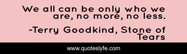 This page presents the quote "We all can be only who we are, no more, no less.". Author of this quote is Terry Goodkind, Stone of Tears. This quote is about enthusiasm, philosophical, inspirational, kahlan,.