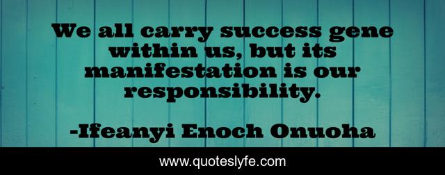 This page presents the quote "We all carry success gene within us, but its manifestation is our responsibility.". Author of this quote is Ifeanyi Enoch Onuoha. This quote is about life, success, wisdom, ifeanyi-enoch-onuoha, responsibility, inspirational, greatness, enthusiasm, gene,.