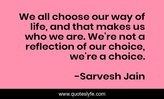 This page presents the quote "We all choose our way of life, and that makes us who we are. We're not a reflection of our choice, we're a choice.". Author of this quote is Sarvesh Jain. This quote is about confidence, love, author, quote, motivational, emotions, reality, optimistic, inspirational,.