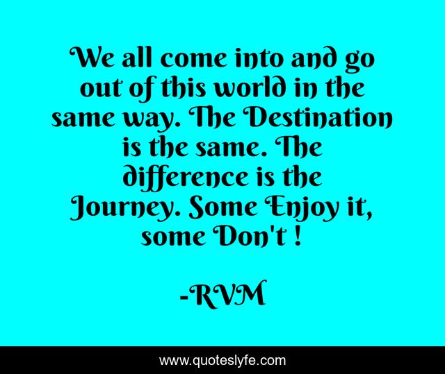 This page presents the quote "We all come into and go out of this world in the same way. The Destination is the same. The difference is the Journey. Some Enjoy it, some Don't !". Author of this quote is RVM. This quote is about motivation, inspiration,.