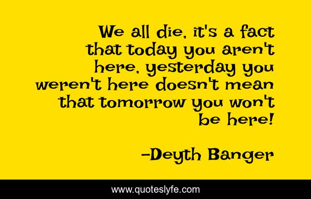 This page presents the quote "We all die, it's a fact that today you aren't here, yesterday you weren't here doesn't mean that tomorrow you won't be here!". Author of this quote is Deyth Banger. This quote is about be, won-t, here, doesn-t, tomorrow, fact, mean,.