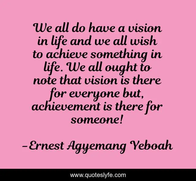 This page presents the quote "We all do have a vision in life and we all wish to achieve something in life. We all ought to note that vision is there for everyone but, achievement is there for someone!". Author of this quote is Ernest Agyemang Yeboah. This quote is about life, dreams, time-wasting, food-for-thought, wisdom, behaviour, attitude, procrastination, time,.
