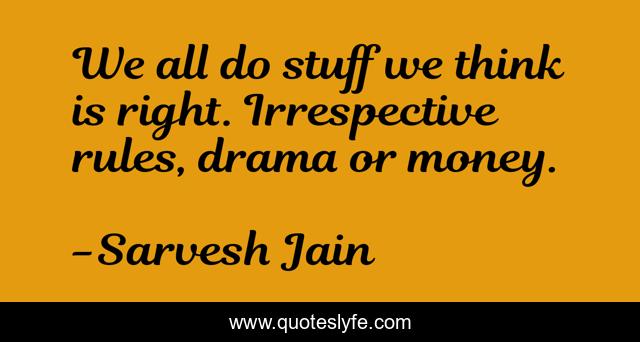 This page presents the quote "We all do stuff we think is right. Irrespective rules, drama or money.". Author of this quote is Sarvesh Jain. This quote is about drama, money, society,.
