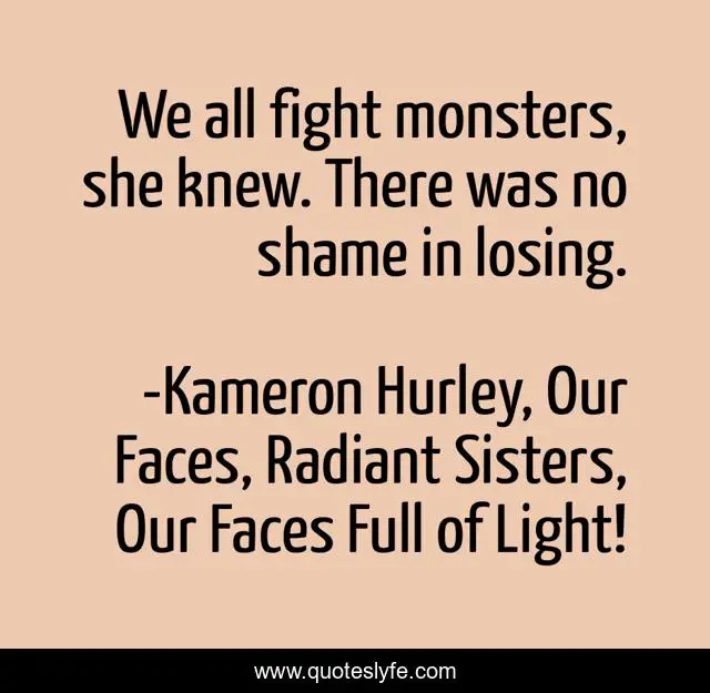 This page presents the quote "We all fight monsters, she knew. There was no shame in losing.". Author of this quote is Kameron Hurley, Our Faces, Radiant Sisters, Our Faces Full of Light!. This quote is about losing, monsters, fighting,.