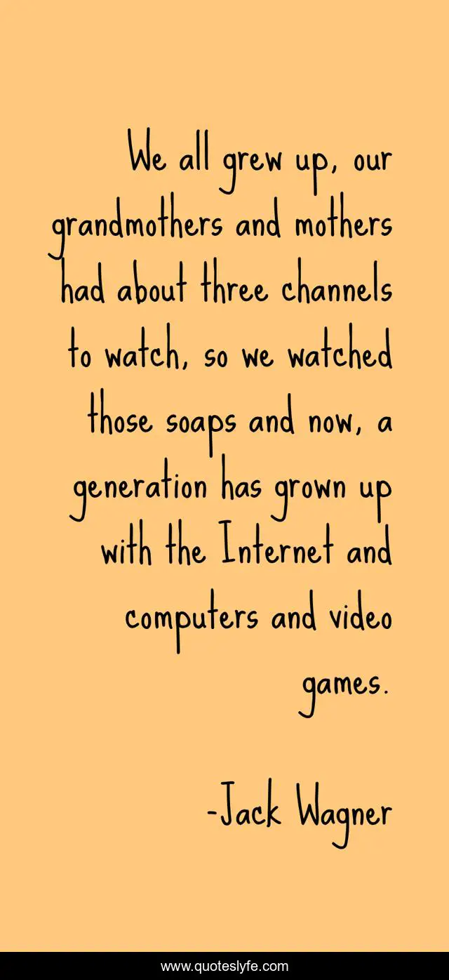 This page presents the quote "We all grew up, our grandmothers and mothers had about three channels to watch, so we watched those soaps and now, a generation has grown up with the Internet and computers and video games.". Author of this quote is Jack Wagner. This quote is about video games, internet,.