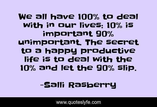 This page presents the quote "We all have 100% to deal with in our lives: 10% is important 90% unimportant. The secret to a happy productive life is to deal with the 10% and let the 90% slip.". Author of this quote is Salli Rasberry. .