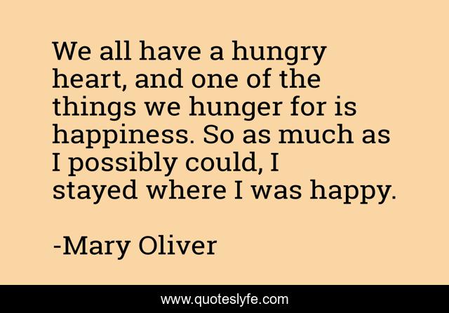 This page presents the quote "We all have a hungry heart, and one of the things we hunger for is happiness. So as much as I possibly could, I stayed where I was happy.". Author of this quote is Mary Oliver. This quote is about heart, hungry, happy,.