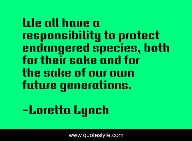 This page presents the quote "We all have a responsibility to protect endangered species, both for their sake and for the sake of our own future generations.". Author of this quote is Loretta Lynch. This quote is about protect, responsibility,.