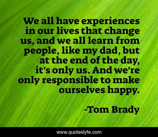 This page presents the quote "We all have experiences in our lives that change us, and we all learn from people, like my dad, but at the end of the day, it's only us. And we're only responsible to make ourselves happy.". Author of this quote is Tom Brady. This quote is about day, change, happy,.