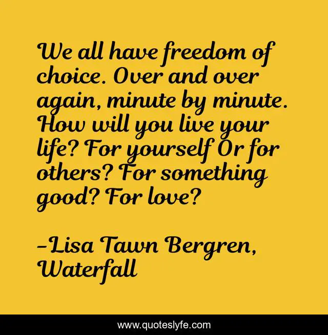 This page presents the quote "We all have freedom of choice. Over and over again, minute by minute. How will you live your life? For yourself Or for others? For something good? For love?". Author of this quote is Lisa Tawn Bergren, Waterfall. This quote is about life, love, carpe-diem-inspirational, encouragement, life-lessons, life-philosophy, affection,.