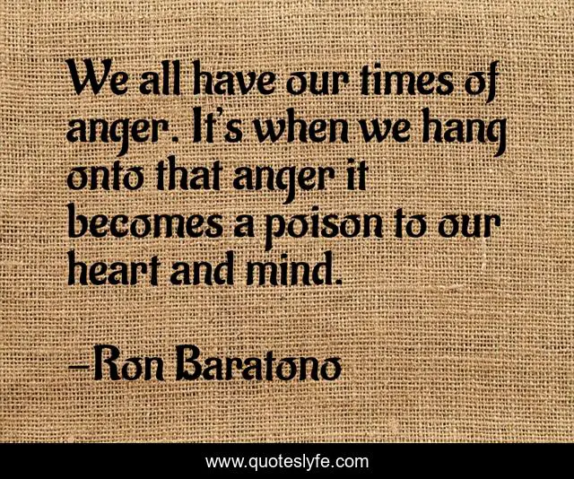 This page presents the quote "We all have our times of anger. It’s when we hang onto that anger it becomes a poison to our heart and mind.". Author of this quote is Ron Baratono. This quote is about anger, forgiveness, mind,.