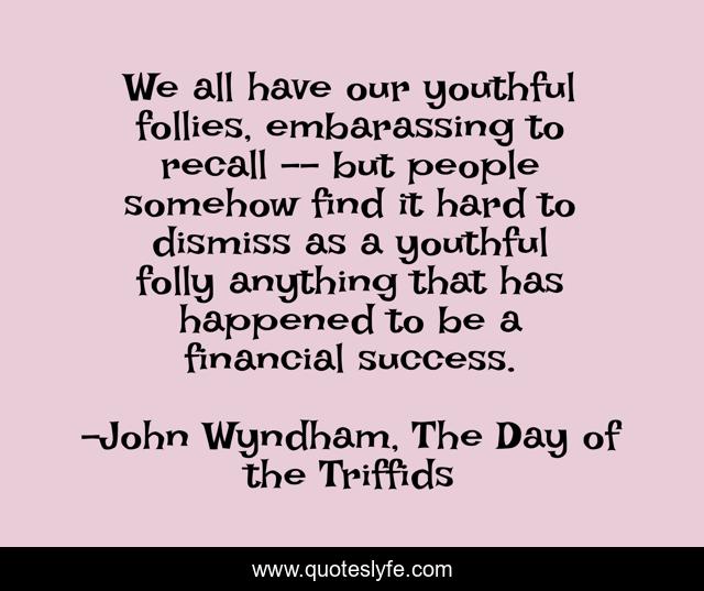 This page presents the quote "We all have our youthful follies, embarassing to recall -- but people somehow find it hard to dismiss as a youthful folly anything that has happened to be a financial success.". Author of this quote is John Wyndham, The Day of the Triffids. This quote is about youth, success, memory,.