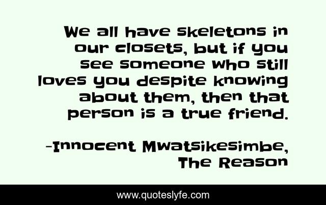 This page presents the quote "We all have skeletons in our closets, but if you see someone who still loves you despite knowing about them, then that person is a true friend.". Author of this quote is Innocent Mwatsikesimbe, The Reason. This quote is about life, friendship, self-improvement, friend,.