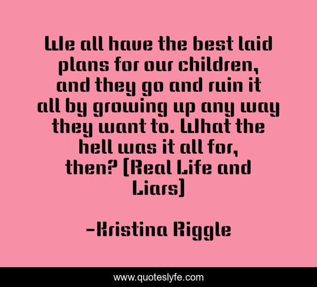 This page presents the quote "We all have the best laid plans for our children, and they go and ruin it all by growing up any way they want to. What the hell was it all for, then? (Real Life and Liars)". Author of this quote is Kristina Riggle. This quote is about life, cancer, mothers, poignant, fiction, parenting, real-life,.