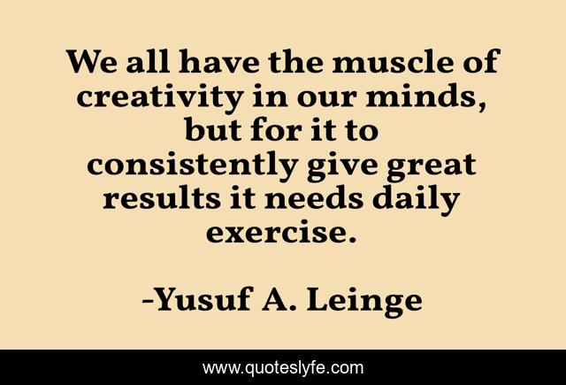 This page presents the quote "We all have the muscle of creativity in our minds, but for it to consistently give great results it needs daily exercise.". Author of this quote is Yusuf A. Leinge. This quote is about growth, creativity, results, exercise, muscle,.