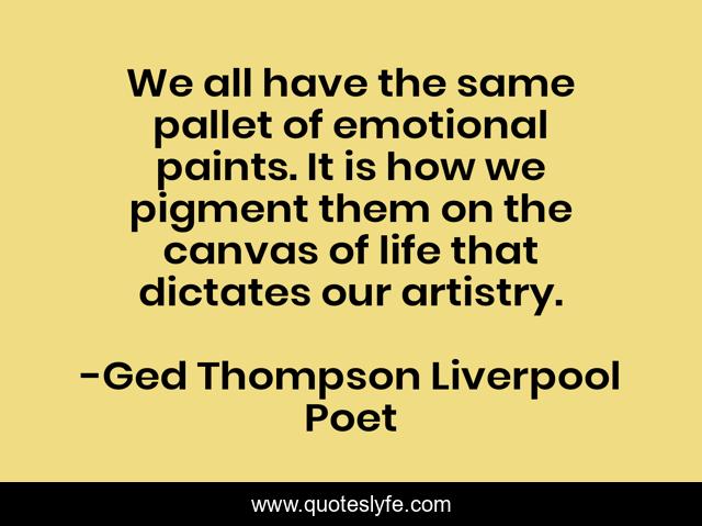 This page presents the quote "We all have the same pallet of emotional paints. It is how we pigment them on the canvas of life that dictates our artistry.". Author of this quote is Ged Thompson Liverpool Poet. This quote is about rt, emotional-intelligence, emotions,.