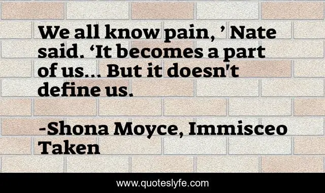 This page presents the quote "We all know pain, ’ Nate said. ‘It becomes a part of us… But it doesn't define us.". Author of this quote is Shona Moyce, Immisceo Taken. .