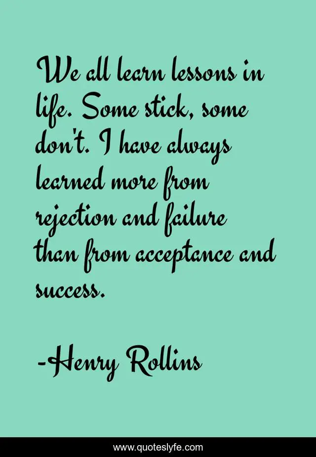 This page presents the quote "We all learn lessons in life. Some stick, some don't. I have always learned more from rejection and failure than from acceptance and success.". Author of this quote is Henry Rollins. This quote is about life, acceptance, success,.