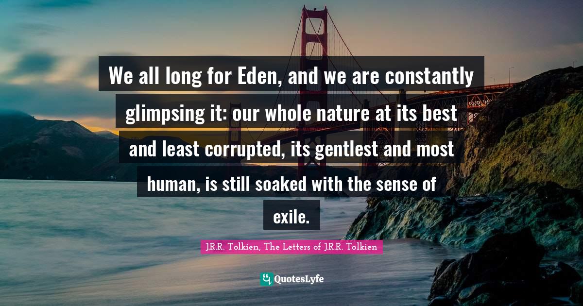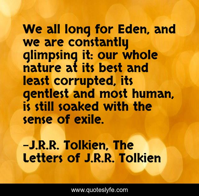 This page presents the quote "We all long for Eden, and we are constantly glimpsing it: our whole nature at its best and least corrupted, its gentlest and most human, is still soaked with the sense of exile.". Author of this quote is J.R.R. Tolkien, The Letters of J.R.R. Tolkien. This quote is about god, redemption, eden,.