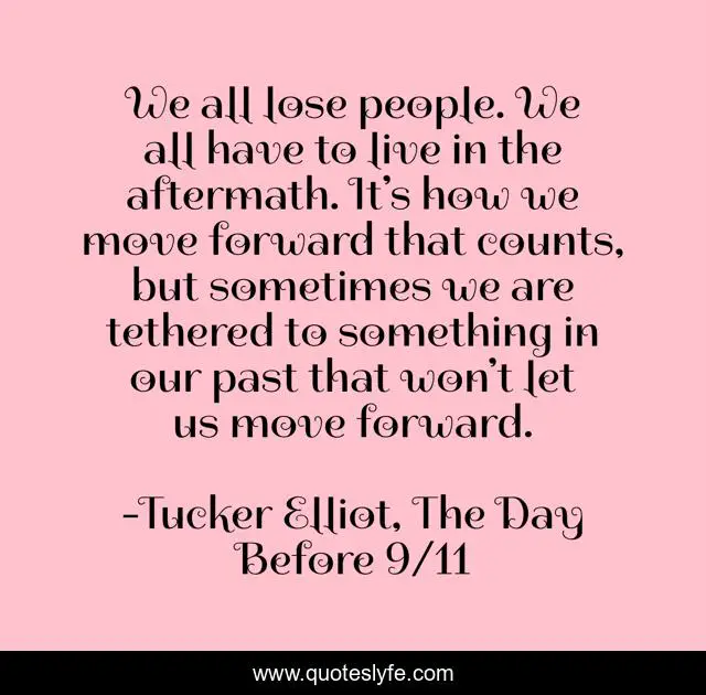 This page presents the quote "We all lose people. We all have to live in the aftermath. It’s how we move forward that counts, but sometimes we are tethered to something in our past that won’t let us move forward.". Author of this quote is Tucker Elliot, The Day Before 9/11. This quote is about afghanistan, korea, education, germany, tucker-elliot, military, terrorism, iraq, 9-11,.