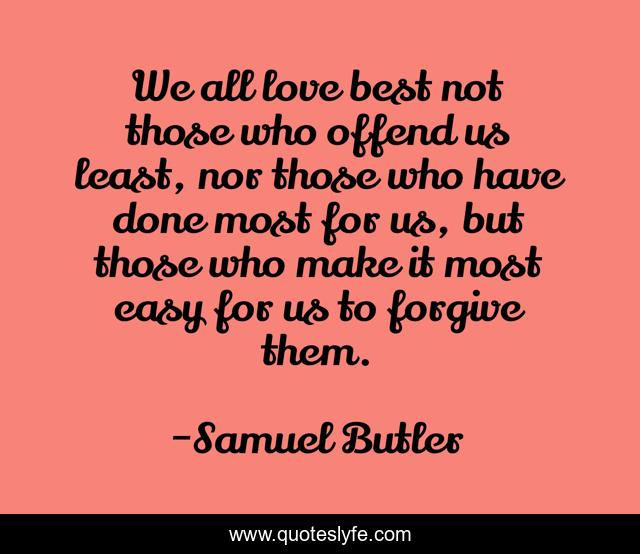 This page presents the quote "We all love best not those who offend us least, nor those who have done most for us, but those who make it most easy for us to forgive them.". Author of this quote is Samuel Butler. This quote is about forgiveness, love, affection,.