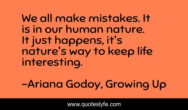 This page presents the quote "We all make mistakes. It is in our human nature. It just happens, it's nature's way to keep life interesting.". Author of this quote is Ariana Godoy, Growing Up. This quote is about human-nature, life, mistakes, interesting,.