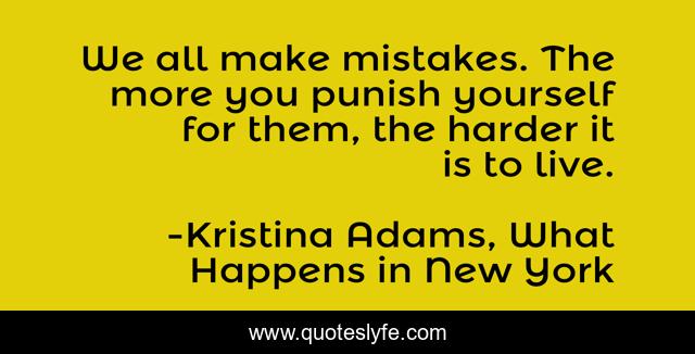 This page presents the quote "We all make mistakes. The more you punish yourself for them, the harder it is to live.". Author of this quote is Kristina Adams, What Happens in New York. This quote is about inspirational, philosophy, inspirational-attitude, mistakes, life-lessons, enthusiasm, life-and-living, punishment,.