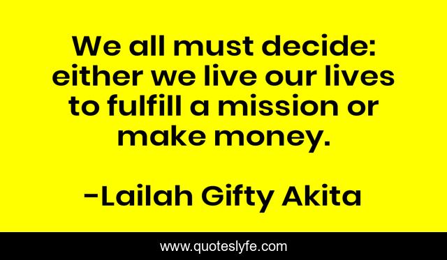 This page presents the quote "We all must decide: either we live our lives to fulfill a mission or make money.". Author of this quote is Lailah Gifty Akita. This quote is about living, inspiring, money, faith-decision, calling, life-lessons, crossroad, mission,.