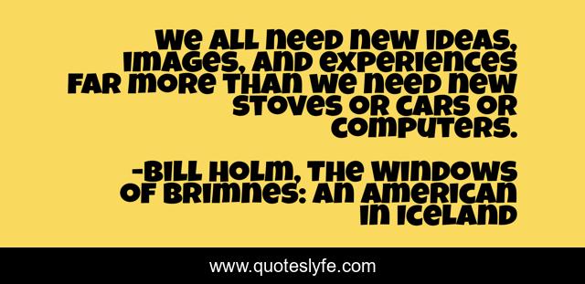 This page presents the quote "We all need new ideas, images, and experiences far more than we need new stoves or cars or computers.". Author of this quote is Bill Holm, The Windows of Brimnes: An American in Iceland. .
