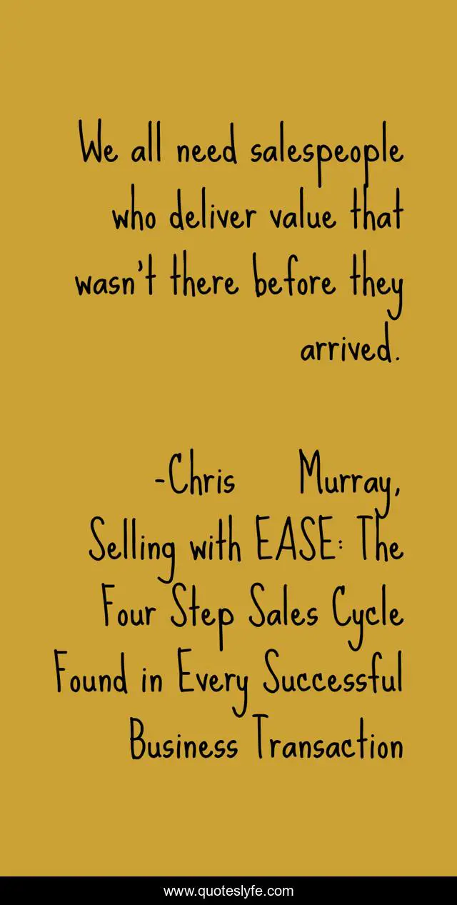 "Chris Murray, Selling with EASE: The Four Step Sales Cycle Found in Every Successful Business Transaction Quotes." Quoteslyfe.com, 2025. Sun. 07 Dec. 2025. <https://www.quoteslyfe.com/quote/We-all-need-salespeople-who-deliver-value-80272>.