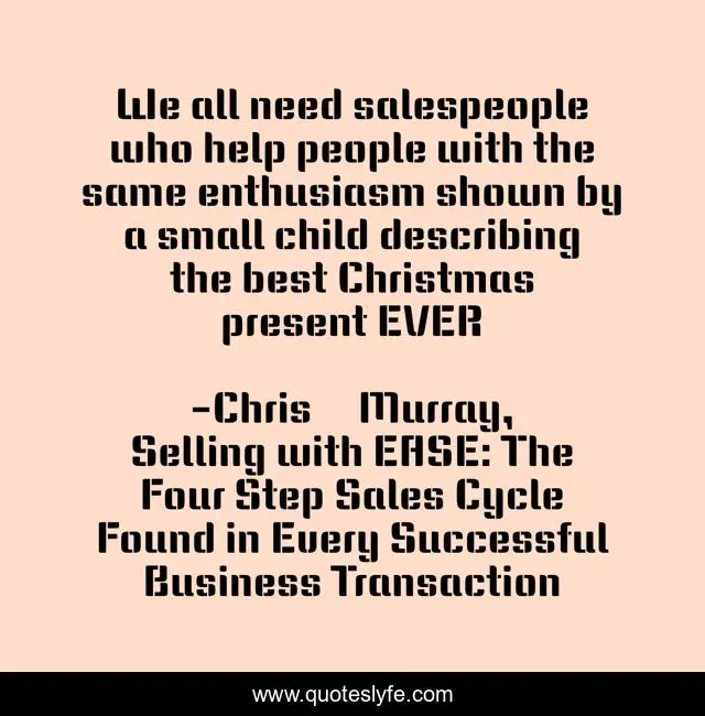 This page presents the quote "We all need salespeople who help people with the same enthusiasm shown by a small child describing the best Christmas present EVER". Author of this quote is Chris Murray, Selling with EASE: The Four Step Sales Cycle Found in Every Successful Business Transaction. This quote is about business-success, negotiation, customers, selling-tips, business-advice, sales-training, business, money, influence,.