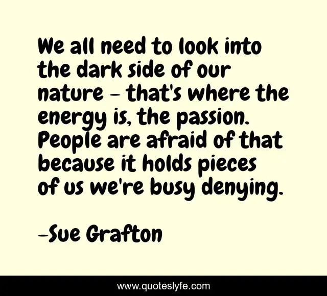 This page presents the quote "We all need to look into the dark side of our nature - that's where the energy is, the passion. People are afraid of that because it holds pieces of us we're busy denying.". Author of this quote is Sue Grafton. This quote is about dark, busy, passion,.